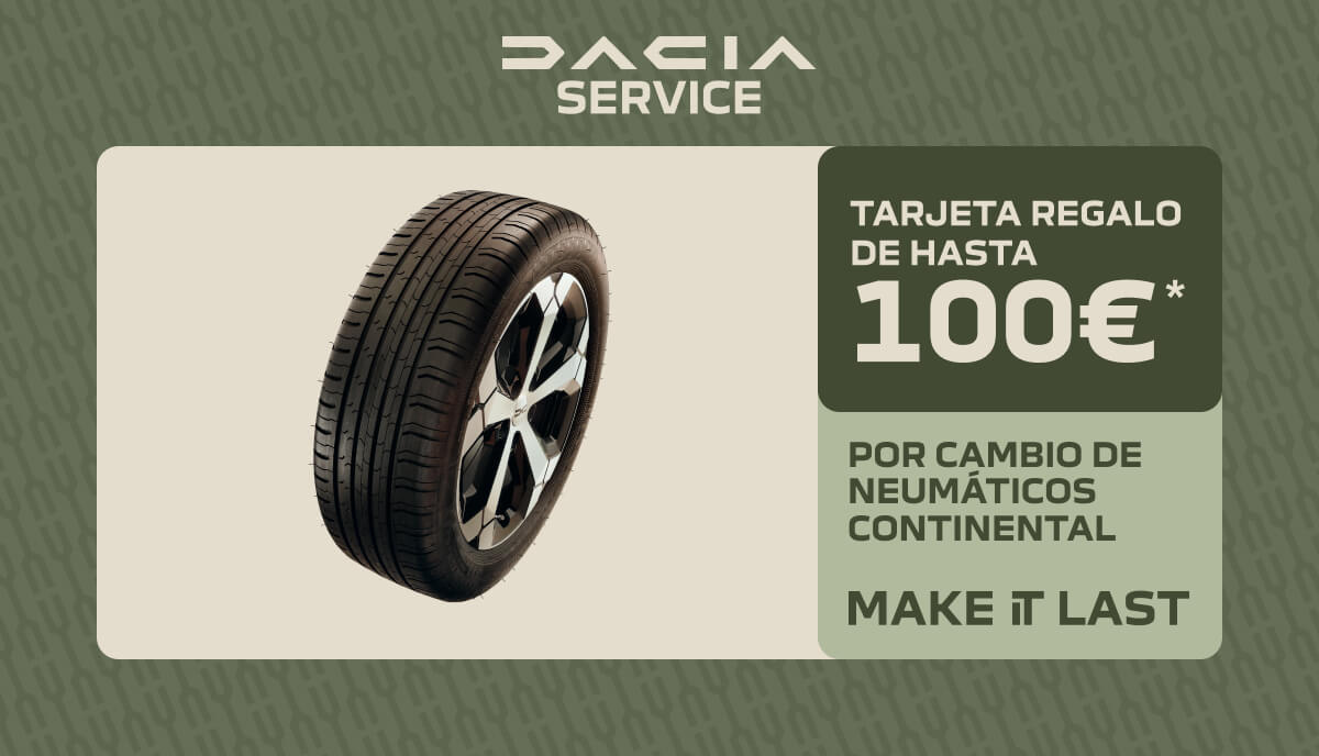 Este otoño a un INcondiconal como tú no se le puede olvidar revisar los neumáticos de su Dacia. Del 10 de noviembre al 15 de diciembre, equipa tu Dacia con neumáticos Continental y podrás conseguir una tarjeta regalo por valor de hasta 100€*. Recuerda que unos neumáticos en buen estado y con una presión adecuada, te ayudarán a optimizar el consumo de combustible y reducir su desgaste.